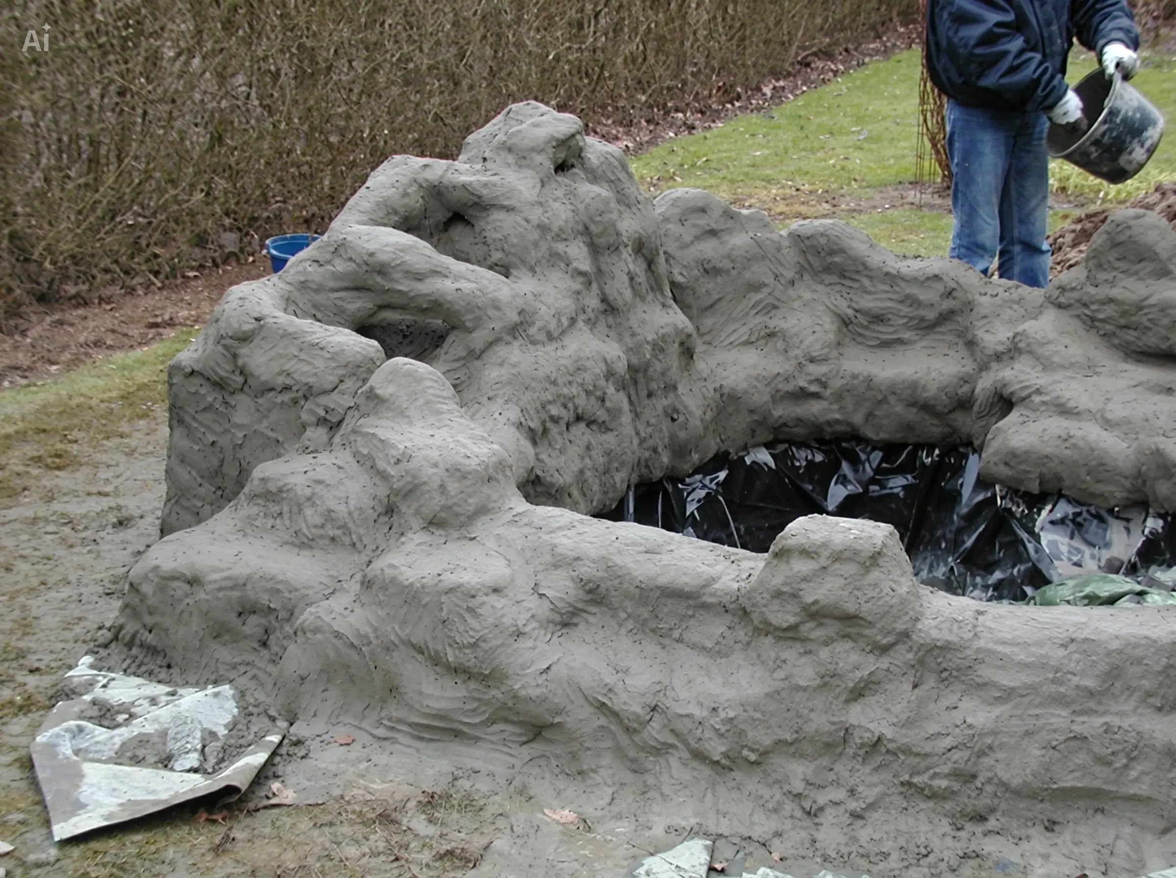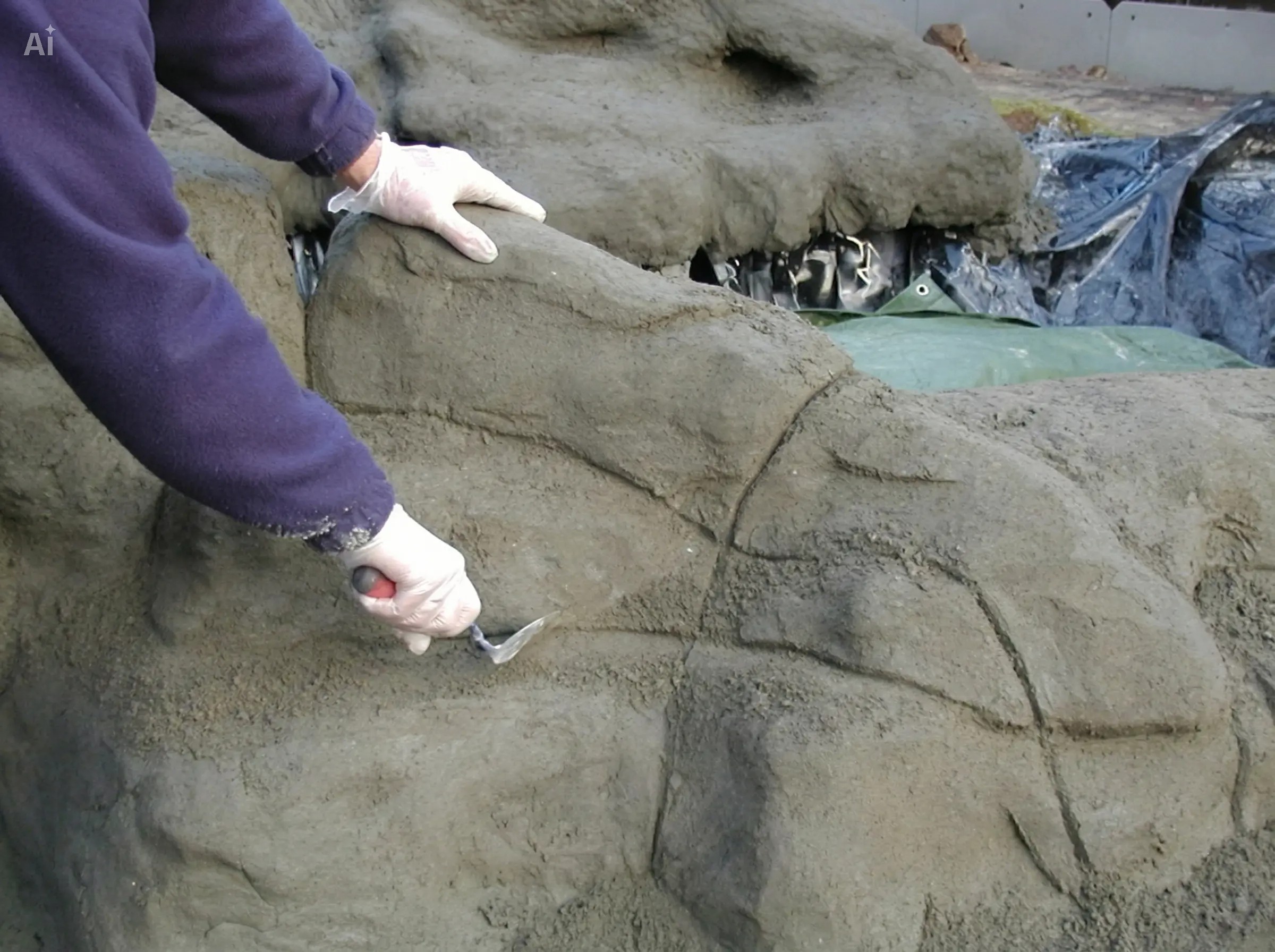 - Modelling: This is where you craft the finer details of your pond’s rockwork. While the concrete is fresh, use brushes or carving tools to sculpt textures, crevices, and stone-like features.